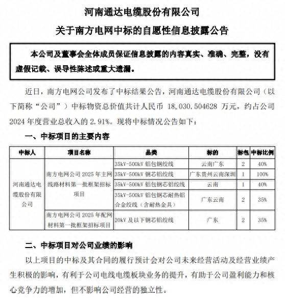 7月9日,通达股份(002560)公告称,近日,南方电网公司发布了中标结果公告,公司中标物资总价值共计人民币18,030.504628万元,约占公司2024年度营业总收入的2.91%。以上项目的中标及其合同的履行预计会对公司未来经营活动及经营业绩产生积极的影响,有利于公司电线电缆板块业务的发展,有助于公司盈利能力和核心竞争力的提升。